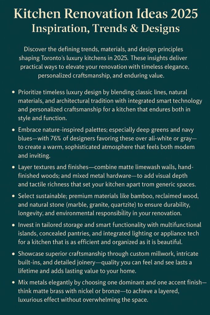 Kitchen renovation ideas 2025 are redefining luxury living in Toronto, blending timeless craftsmanship, nature-inspired color palettes, and smart functionality to create kitchens that elevate daily life while adding long-term value.
